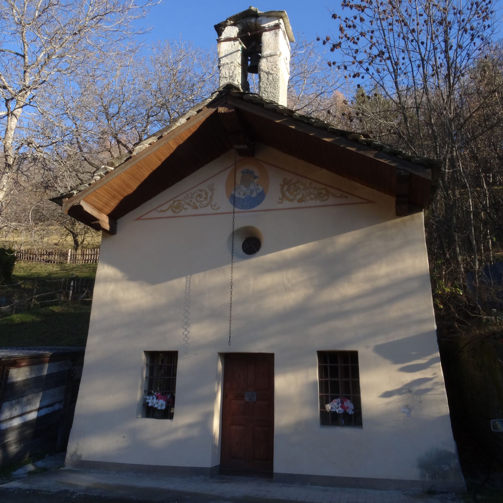 Secondo una memoria lasciataci da un parroco l'erezione di questa cappella dovrebbe risalire alla fine del millecinquecento. Questo sacro edificio ad unica navata è stato costantemente minacciato da infiltrazioni d'acqua che oltre a dare umidità all'interno ne hanno compromesso seriamente la struttura tanto che nel corso del 1877 alcune persone della frazione durante un incontro per definire gli interventi proposero di demolire la cappella e riedificarla a levante del villaggio. Verificati però i costi di questo intervento si decise di soprassedere e di tentare in ogni modo di salvare il salvabile scavando anche dietro all'abside –che si trova contro terra- un vuoto per eliminare le acque piovane.
