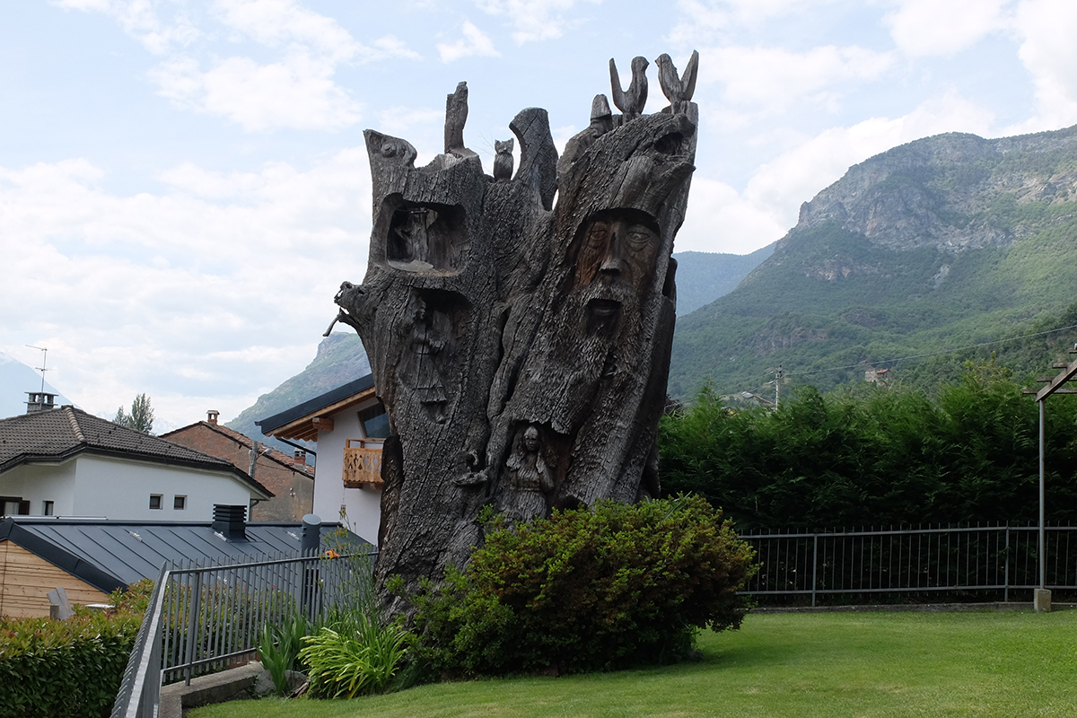Uno di questi castagni di enormi proporzioni, seccato dopo essere vissuto quattro secoli circa e ormai privo dei rami, è stato scolpito sul tronco, nel corso del 1985, dall’artista Chiurato di Saint-Vincent su commissione della locale Amministrazione comunale. Con incredibile bellezza lo scultore propone i personaggi delle leggende, delle storie e dei racconti locali: ecco dunque la prima insurrection des socques; il personaggio dell’avaro raccontato da André Ferré; la solenne figura dell’ecclesiastico Jean-Baptiste Perret che nel 1770 scoprì e valorizzò le acque termali scaturenti dalla Fons Salutis. Nella parte alta è stato anche riprodotto il busto di Napoleone, certamente a ricordo del suo passaggio e sosta nel nostro paese nel maggio del 1800 in previsione della Campagna d’Italia.