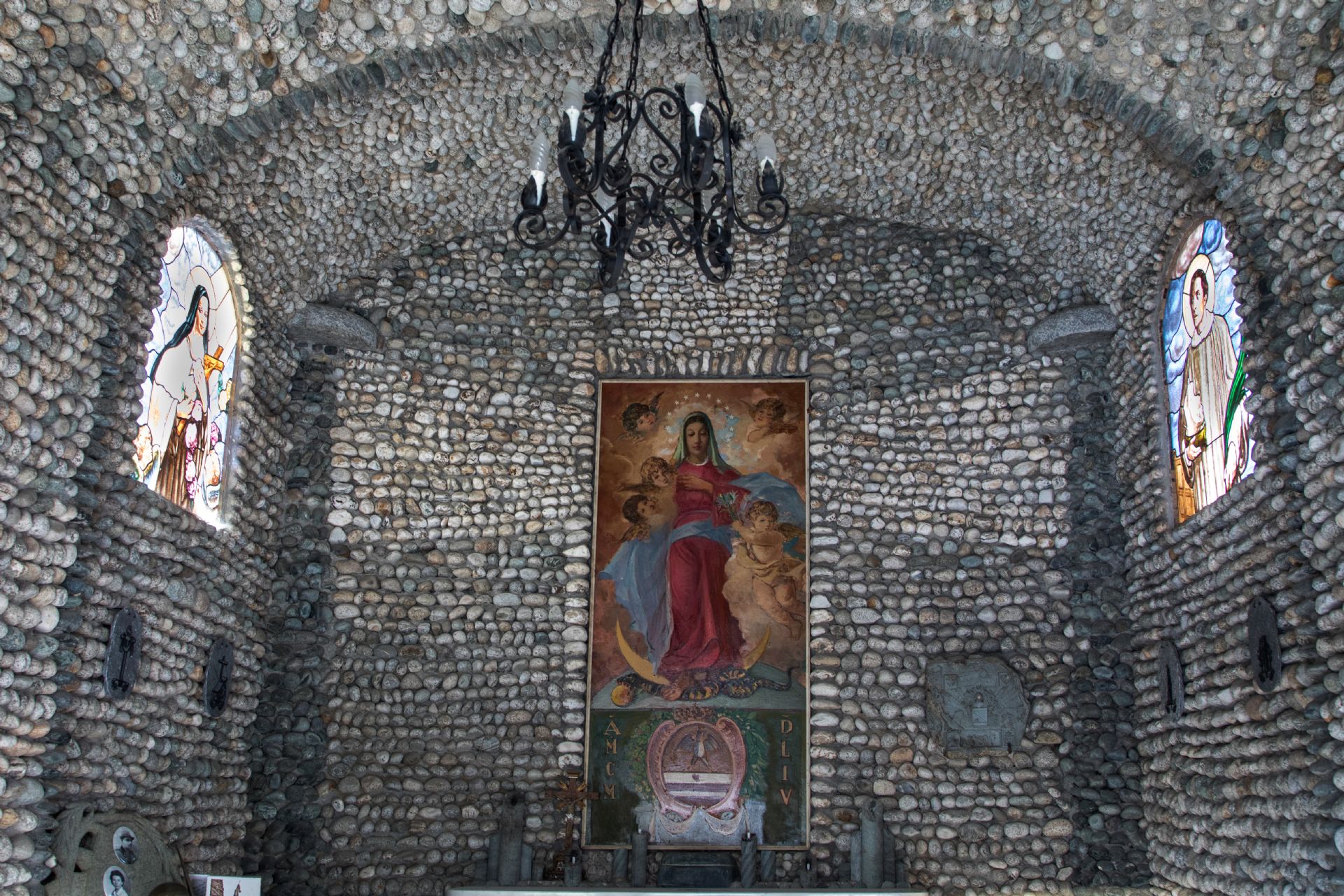L'interno è caratterizzato da una serie di mélanges architettonici basati su di una simbologia che denota grande attenzione ai fatti. Tutto l'interno è rivestito da ciottoli di torrente di diverso colore; il pavimento ha una parte centrale costituita da pietrame bianco che nell'idea del progettista vuole accompagnare il cristiano verso l'altare e verso Dio.