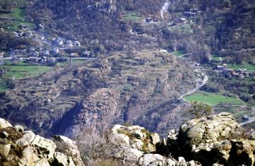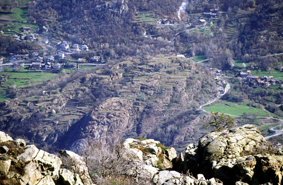 La cresta spartiacque, che ci divide dalla Val d'Ayas, si insella appunto al Col du Joux (1600 m), punto di arrivo del canale irriguo dal Monte Rosa alla “collina” di Saint Vincent. La dorsale tra il Col du Joux ed il Mont Zerbion è una vasta distesa di antiche foreste selvagge ricche di fauna. Lo era anche la dorsale verso la Testa di Comagna prima che si costruissero gli impianti e si tracciassero le piste di sci. Al bordo della foresta inizia la “collina”, il territorio intensamente vissuto nella storia della comunità. La foresta cede il posto a prati terrazzati, che fino alla seconda guerra mondiale erano anche campi di cereali. Le sinuose linee dei muretti assecondano e addolciscono il tormentato rilievo del versante. Numerosi villaggi, stretti fino a toccarsi da un tetto all’altro, si addensano nelle rientranze e sui poggi, là dove il versante mostra una rottura di pendenza. Muri di legno e pietra, tetti di pietra, i villaggi sono collegati da antiche mulattiere selciate più o meno regolarmente con la pietra locale. Certo, tutti i villaggi sono raggiunti dalla strada asfaltata, ma le mulattiere non sono quasi mai abbandonate. Il centro di tutte le mulattiere è Moron, complesso mega-villaggio sulla via del Col du Joux. È tra l’altro dotato di una storica, vivissima chiesa ricca di fascino, di arte e di leggende. Da qui, sempre scendendo, inizia la fascia delle vigne, ed i terrazzamenti assumono grande imponenza. Ripidi e potenti depositi morenici sono scanditi da muri in pietra a secco equidistanti, regolari, in perfetta sintonia col pendio naturale inciso in stretti impluvi. La striscia di terra sostenuta dai muretti è quasi orizzontale, per ben ospitare i filari di vite. Ogni tanto un nuovo lotto di costruzioni sale a dare il benservito ad una vecchia vigna ormai abbandonata, sostituendola con muri di cemento che ci si sforza di rivestire in pietra e in rampicanti. Siamo ormai al capoluogo, fiero della sua antica via Chanoux magnificamente rinnovata e della sua preziosa villa gallo-romana poi divenuta quattrocentesca chiesa parrocchiale. Ancora si può scendere ad ammirare altri imponenti terrazzamenti e antiche case signorili nei raccolti villaggi lungo la Dora, per finire all’acrobatico passaggio che nei secoli sfida vittoriosamente ogni alluvione, l’antichissimo Ponte delle Capre
