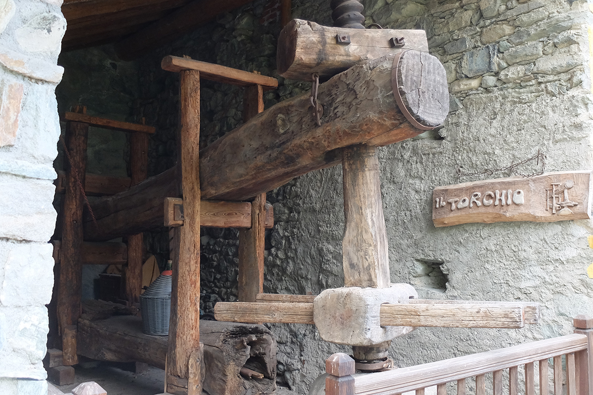 Nulla vieta però di immaginare, con verosimile certezza, che l’antico “pressoir” fosse già presente in loco da molto prima del 1770; questo torchio, nelle sue componenti essenziali, è perfettamente simile a quelli presenti in altri villaggi e un recentissimo restauro voluto dalla locale Amministrazione Comunale ha finalmente ridato giusta dignità all’insieme che, dopo secoli, era impietosamente giunto ormai da alcuni decenni, ad uno stato di totale abbandono. Con progetto dell’Architetto Giuseppe Rollandin di Saint-Vincent e con tanta attenzione da parte dell’artigiano esecutore dei lavori, sono state ripulite tutte le componenti costituite da pregiato legno di noce: tutte le sue parti costituite dal grande trave lungo circa sette metri, la vite (alta tre metri circa), la pietra di contrappeso, il pianale e le guide, dopo i necessari lavori sono state riassemblate così come la struttura in pietra dello stabile che, sovrastata da un tetto ad unica falda in lose, è stata consolidata e in parte rifatta ex novo.