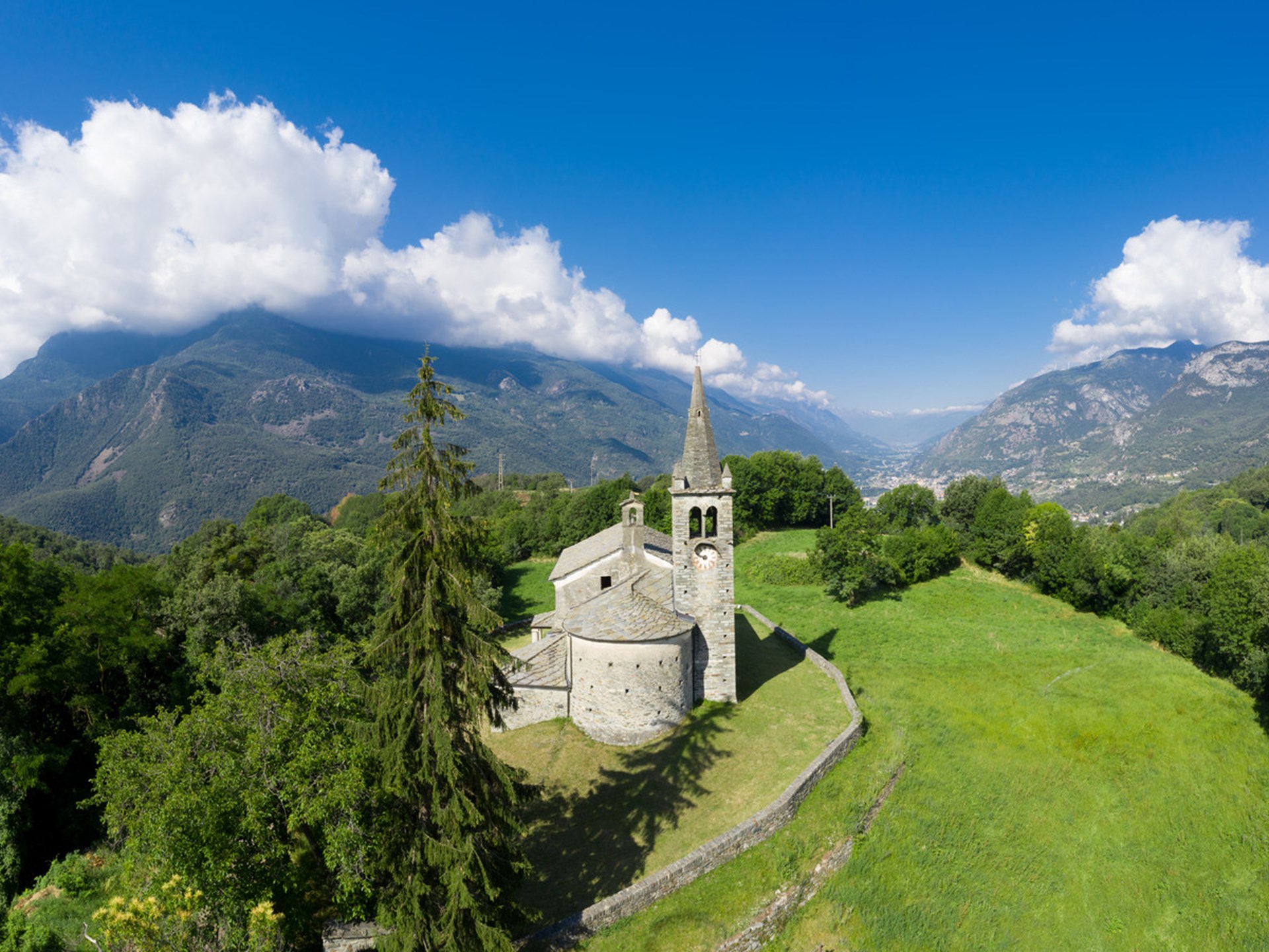 Dal portico antistante si può spaziare lo sguardo su tutta la Valle centrale, sulla collina, sul m. Zerbion e su altre cime.